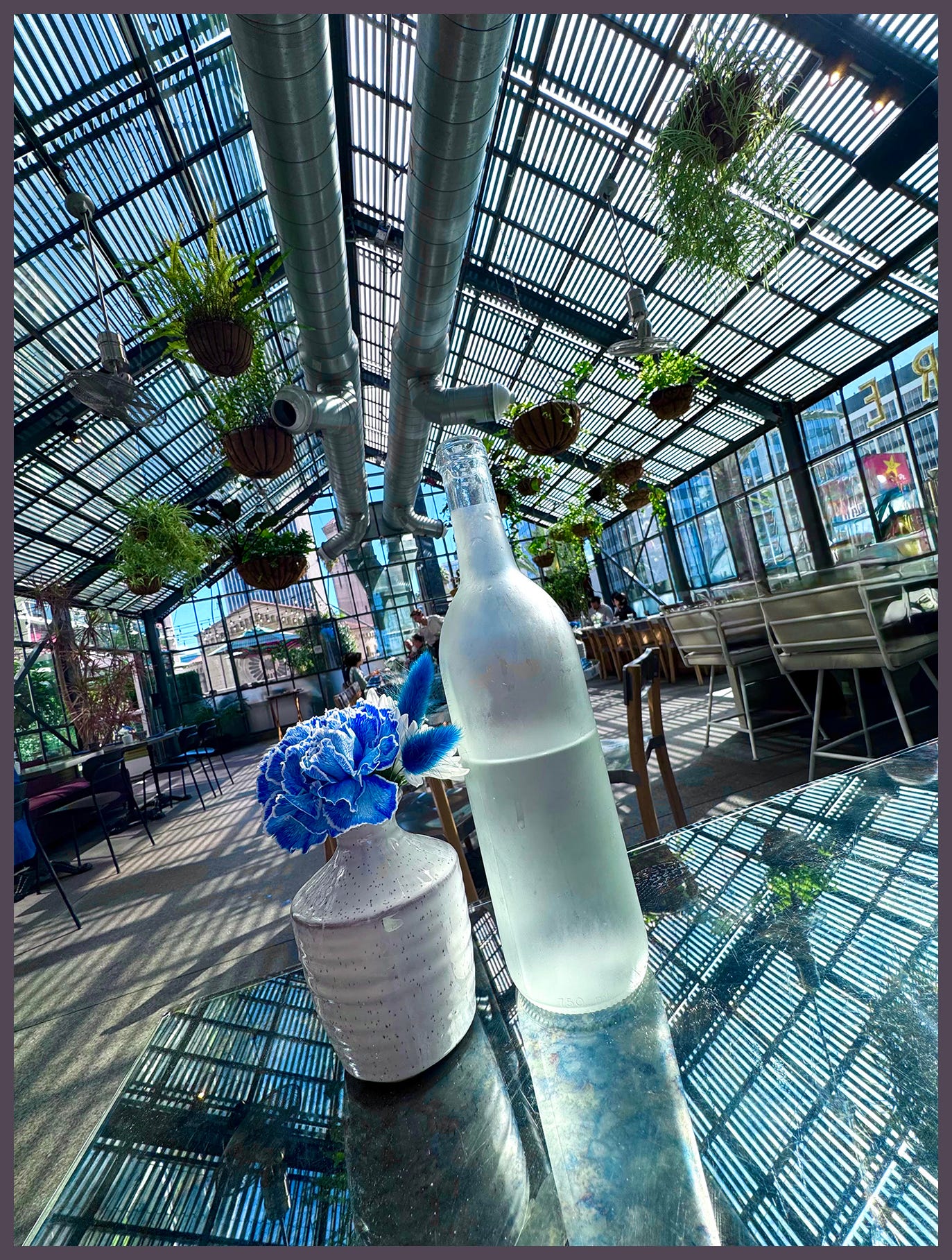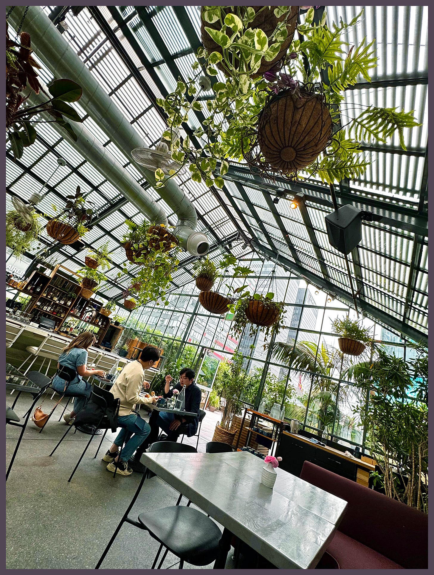 I breathed out, taking in my familiar surroundings: a small cathedral of glass adorned with thriving bushels of hanging plants, and just enough breeze and California sunshine. A cozy, empty perch atop a hotel roof.